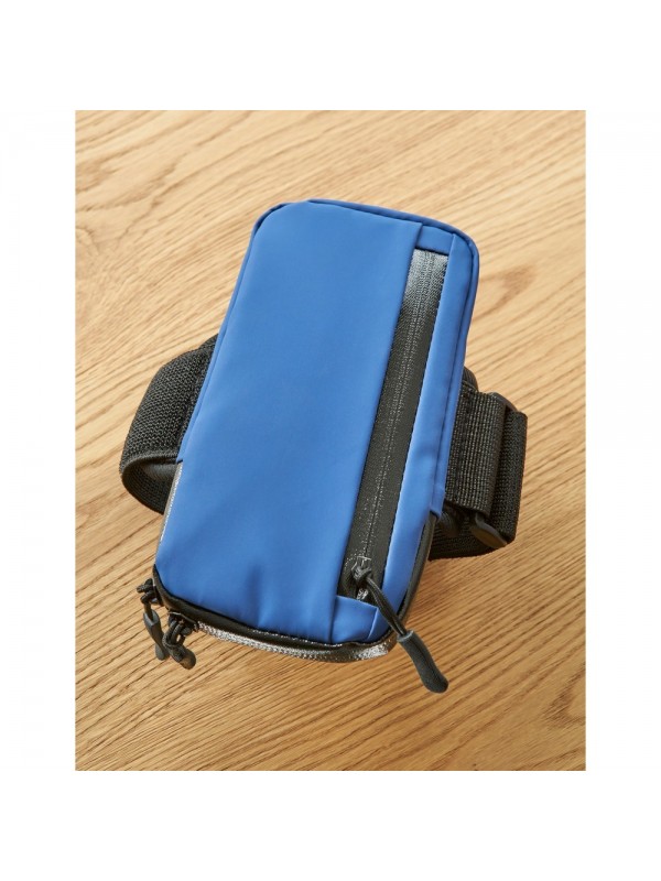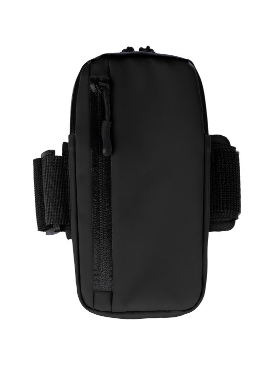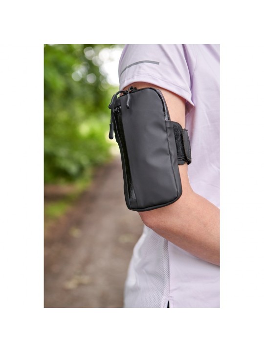 Opaska na ramię funkcjonująca jako etui na telefon, przeznaczona do noszenia na ramieniu, przyda się do uprawniania sportu oraz ćwiczeń, zawiera dużą wodoodporną komorę zapinaną na zamek, mała kieszeń wewnątrz i wodoodporna kieszeń z przodu, produkt wykonany z poliestru