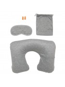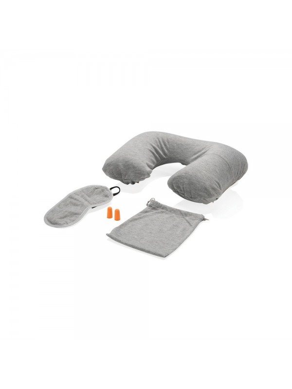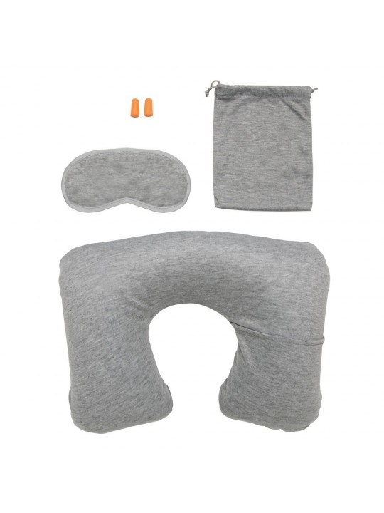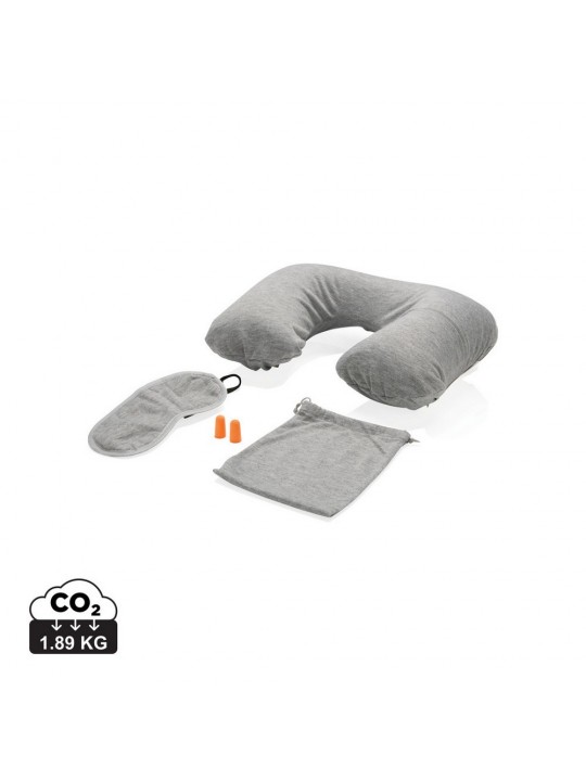 Zestaw akcesoriów podróżnych, miękkie zatyczki do uszu, maska na oczy, dmuchany zagłówek, posiada kieszeń na telefon lub słuchawki, pokrowiec ze ściągaczami w komplecie, ślad węglowy produktu: 1,89 kg CO2