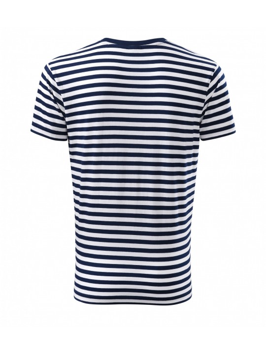 prążki w kombinacji kolorów biały i granatowy, krój ze szwami bocznymi, wąska lamówka z dzianiny ściągaczowej 1:1 z dodatkiem 5 % elastanu, lamówka na karku wzmocniona taśmą z materiału wierzchniego, szew wzmacniający na ramionach