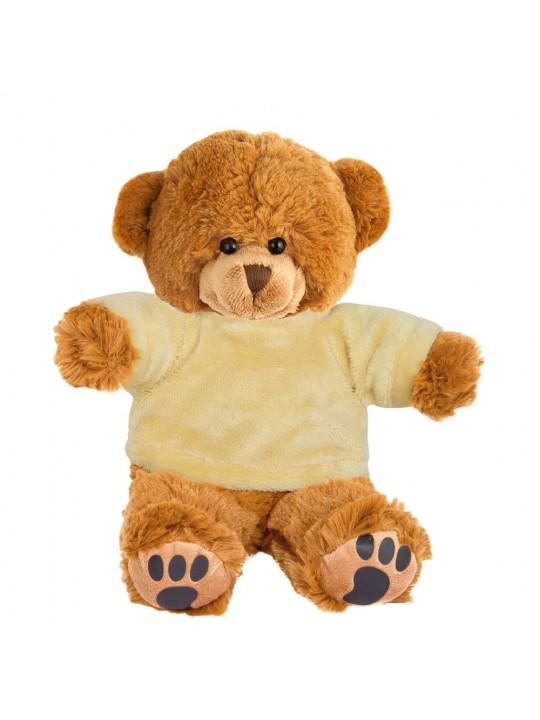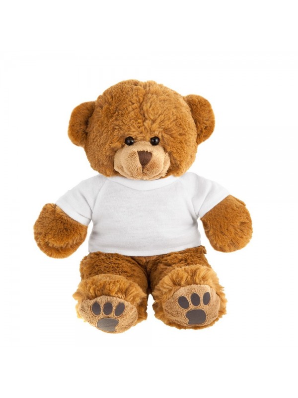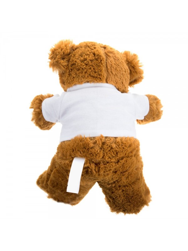 Brązowy miś z białą koszulką pod nadruk, nieoznakowana koszulka z poliestru jest pakowana oddzielnie, na życzenie można wymienić białą koszulkę na żółtą z weluru, produkt wykonany z pluszu