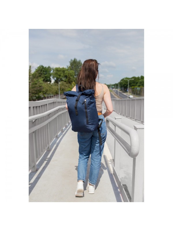 Plecak z przednią kieszenią i główną przegrodą na zamek błyskawiczny, wykonany z RPET, zgodny z certyfikatem GRS (Global RecycIed Standard), 2 kieszenie boczne, rozwijalna główna kieszeń zamykana na klamrę, która umożliwia zwiększanie pojemności plecaka oraz lepiej chroni przed czynnikami atmosferycznymi po zwinięciu, regulowane paski na ramię