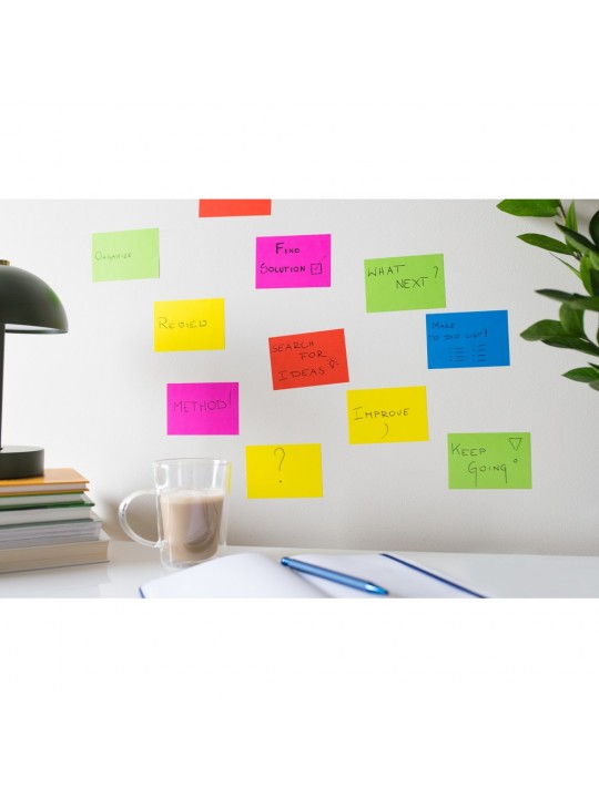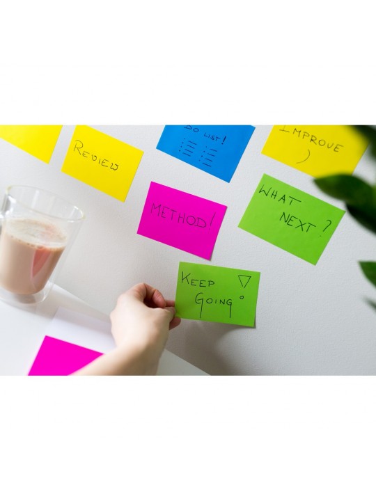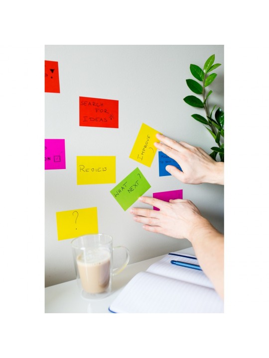 Karteczki samoprzylepne, przylegają do powierzchni za pomocą ładunku elektrostatycznego, dzięki czemu nie zostawiają śladów po kleju na powierzchniach, umożliwiają łatwą reorganizację notatek np. podczas szkoleń lub prezentacji, 100 szt., produkt wykonany z papieru oraz folii PP. Wyprodukowany w Europie.