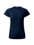 prążki w kombinacji kolorów biały i granatowy, dopasowany krój ze szwami bocznymi, szersza okrągła lamówka, wąska lamówka z dzianiny ściągaczowej 1:1 z dodatkiem 5 % elastanu, lamówka na karku wzmocniona taśmą z materiału wierzchniego, szew wzmacniający na ramionach, bardzo krótkie rękawy