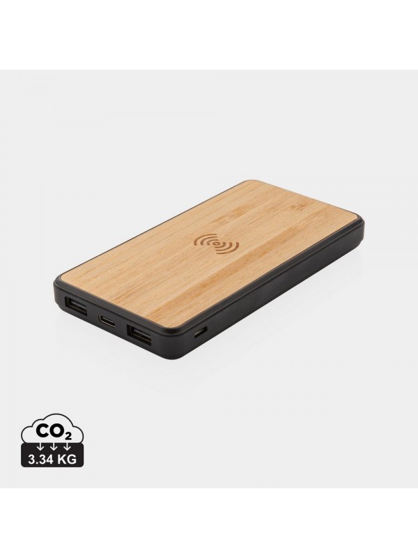 Power bank 8000 mAh, ładowarka bezprzewodowa 5W, działa z telefonami posiadającymi możliwość ładowania indukcyjnego, wykonany z ABS z recyklingu z certyfikatem RCS i bambusa z certyfikatem FSC®, całkowita zawartość materiałów z recyklingu: 20%, obliczona na podstawie masy całkowitej przedmiotu, wbudowany akumulator litowo polimerowy o wysokiej gęstości, wejście USB typu C 5V/2A, wejście micro USB 5V/2A, wyjście 5V/2.4A, w komplecie kabel z TPE z recyklingu z certyfikatem RCS®, ślad węglowy produktu: 3,34 kg CO2