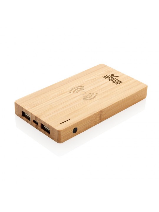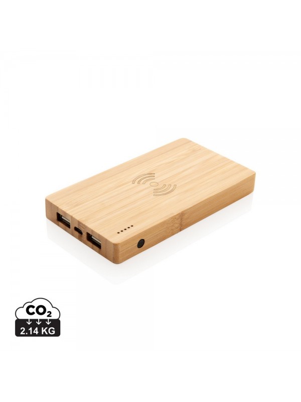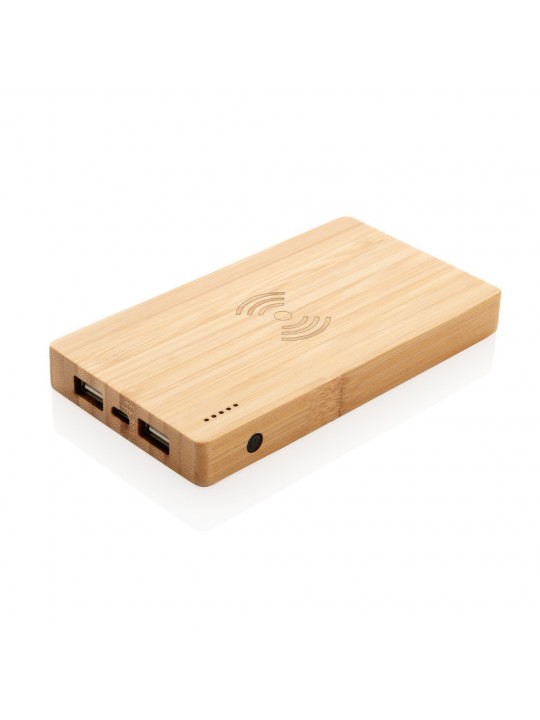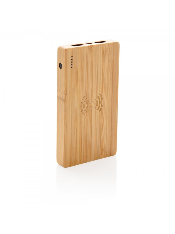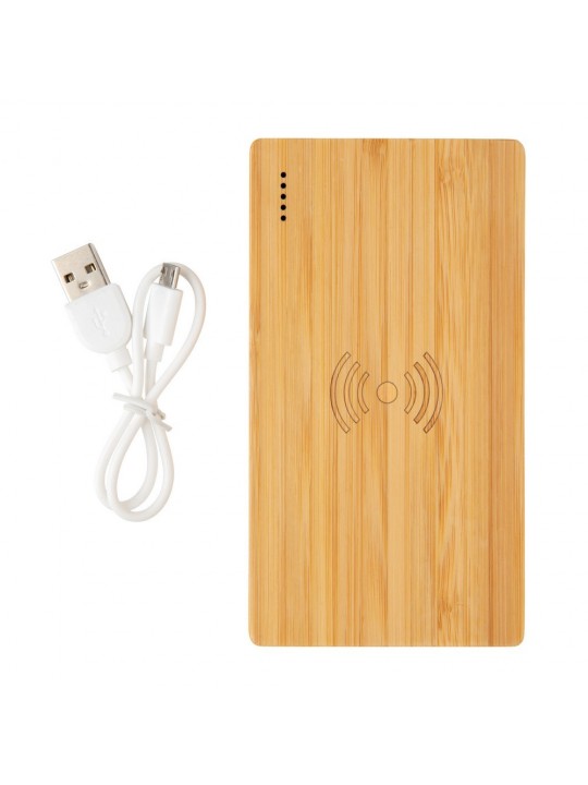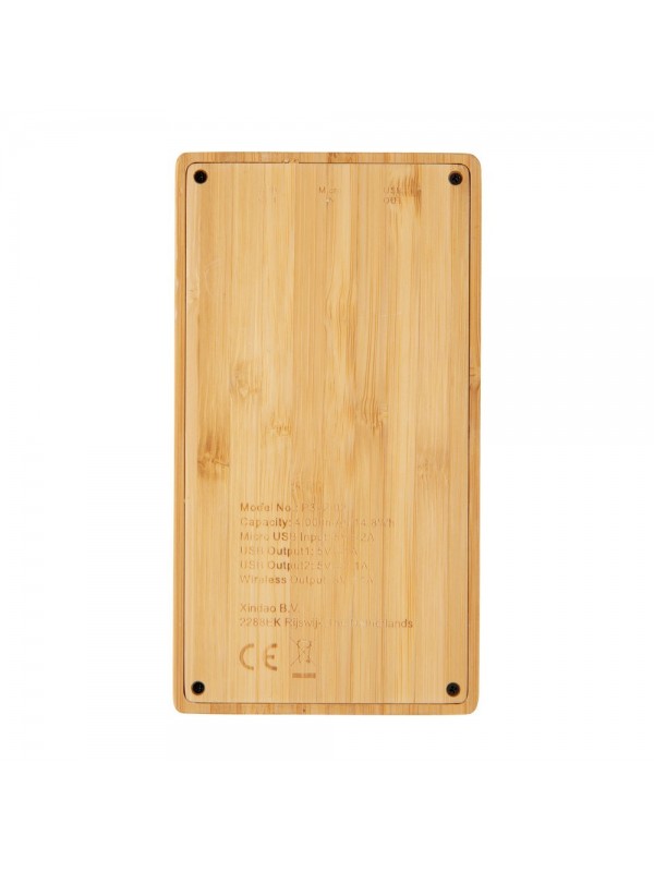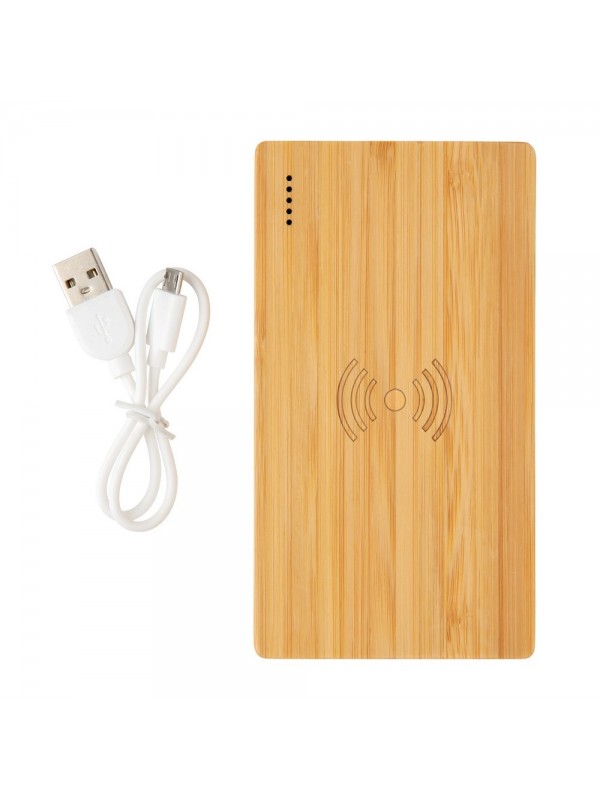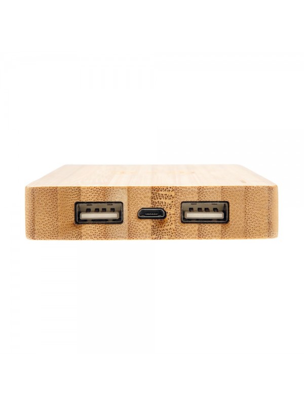 Bezprzewodowy power bank 4000 mAh, ładowarka bezprzewodowa 5W, 5 diod wskazujących poziom naładowania, wykonany z naturalnego bambusa, wbudowany akumulator litowo-polimerowy klasy A o dużej gęstości i trwałości, możliwość ładowania kablem i bezprzewodowo, w pełni naładowane urządzenie może naładować telefon do 2 razy, bezprzewodowe ładowanie jest kompatybilne ze wszystkimi urządzeniami posiadającymi możliwość ładowania indukcyjnego, wejście 5V/2A, wyjście USB 5V/2A, wyjście bezprzewodowe 5W 5V/1A, kabel micro USB w komplecie