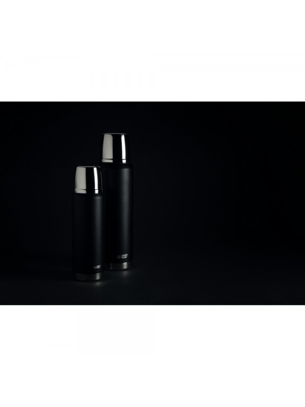 Termos 500 ml z izolacją próżniową, podwójne ścianki, wnętrze ze stali nierdzewnej 18/8, powlekany proszkowo czarny kolor cechujący się niezwykłą trwałością i odpornością na wyblaknięcie czy popękanie, ściana wewnętrzna pokryta miedzią o wysokim poziomie przewodnictwa, wyłącznie mycie ręczne, utrzymuje temperaturę napojów gorących do 20 godzin oraz zimnych do 24 godzin +leakproof