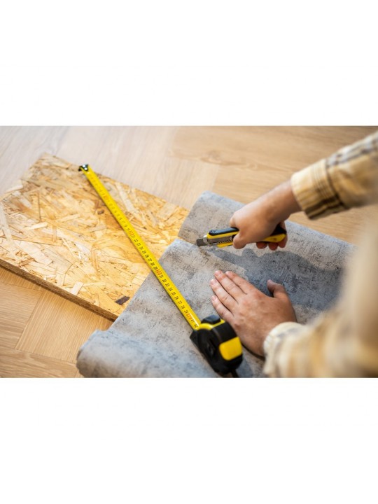 Miara 5 m z uchwytem ułatwiającym noszenie oraz dodatkowym klipem umożliwiającym przyczepienie np. do paska, na końcu znajduje się magnetyczny zaczep ułatwiający korzystanie z miary, produkt wykonany z metalu i plastiku
