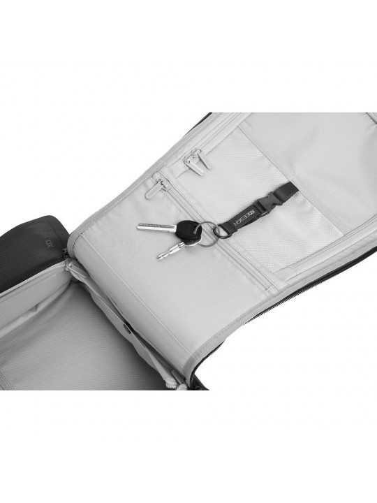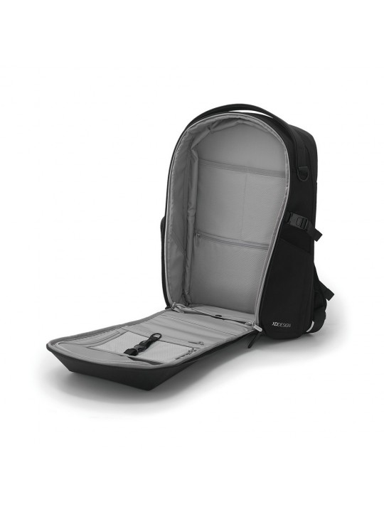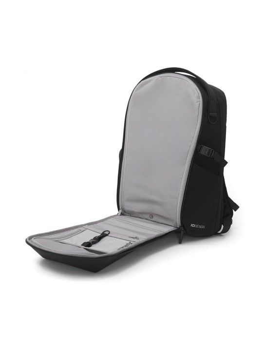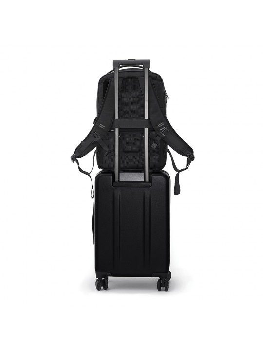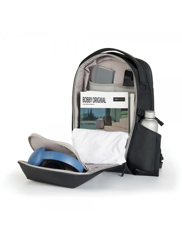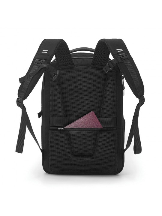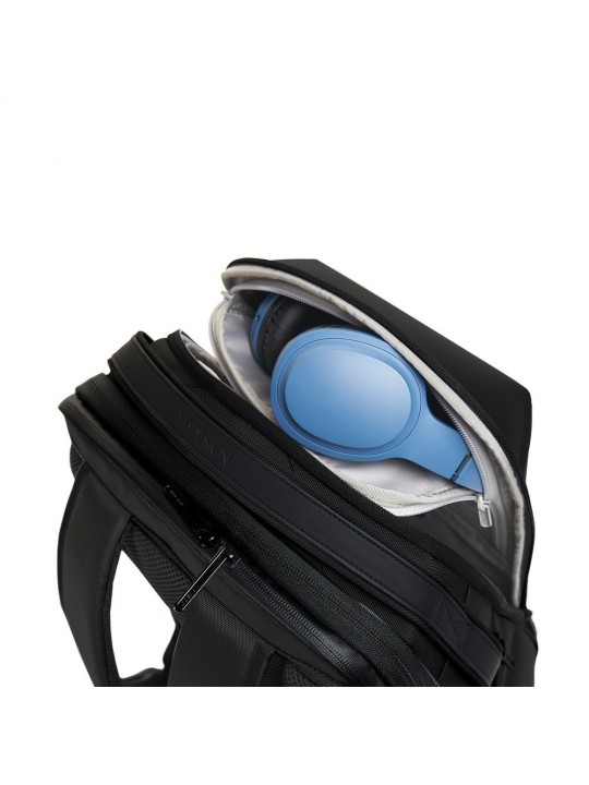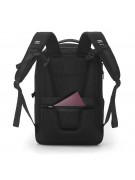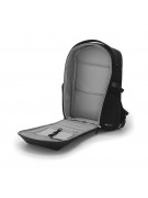 Plecak na laptopa do 16”, przegroda główna otwierana pod kątem 180 stopni, wewnątrz kieszenie z siatki, wiele kieszeni na zewnątrz, kieszeń na butelkę zamykana na magnes, kieszeń z odpinaną smyczą na klucze, wodoodporny, wykonany z materiałów pochodzących z recyklingu, posiada wbudowany znacznik AWARE™, który potwierdza wykorzystanie materiałów z recyklingu, ślad węglowy produktu: 8,03 kg CO2