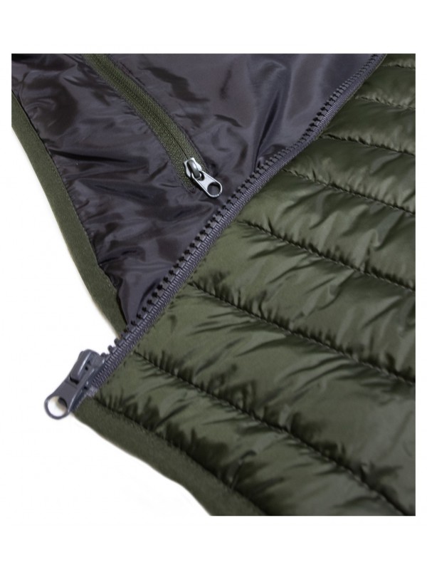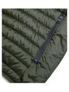 składany do wewnętrznej kieszeni, pikowany lekki, ciepły materiał, krój z bocznymi częściami, kostkowy zamek błyskawiczny na całej długości z ochroną podbródka, kieszenie z formowanym zamkiem błyskawicznym, kieszeń wewnętrzna zapinana na rzep, dostęp do brandingu z boku, regulacja kołnierza elastycznym paskiem