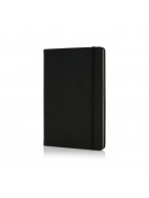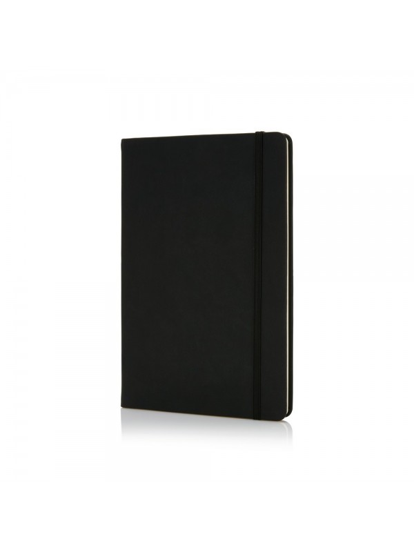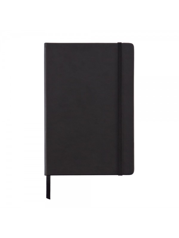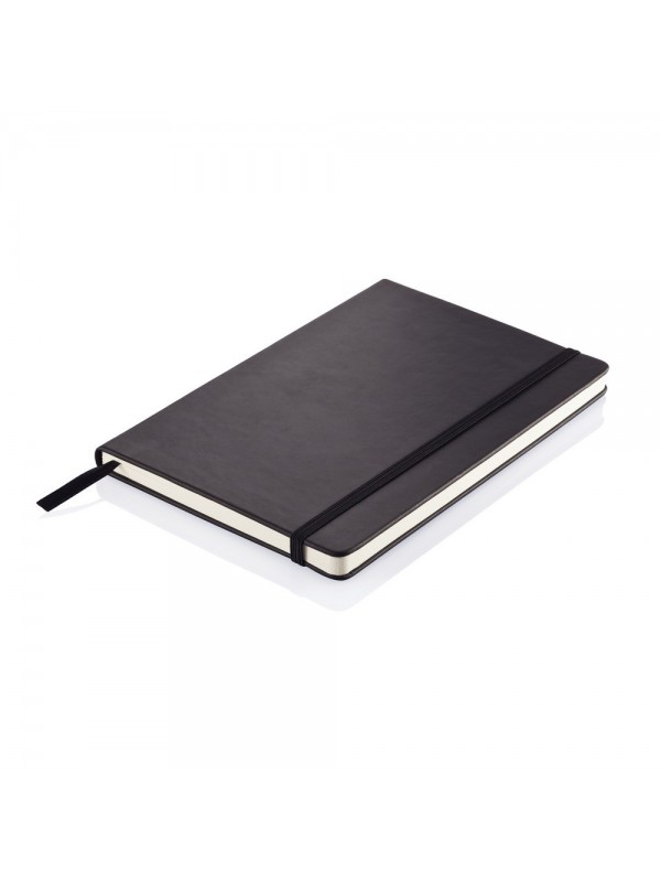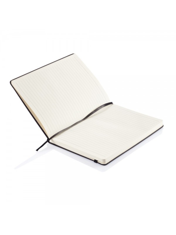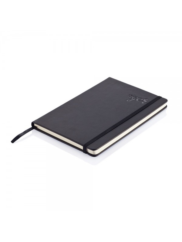 Notatnik A5 (80 kartek 80 g/m2 w linie), twarda okładka z PU doskonale nadaje się do tłoczenia, tasiemka zakładkowa i elastyczna opaska do zamykania, ślad węglowy produktu: 0,67 kg CO2