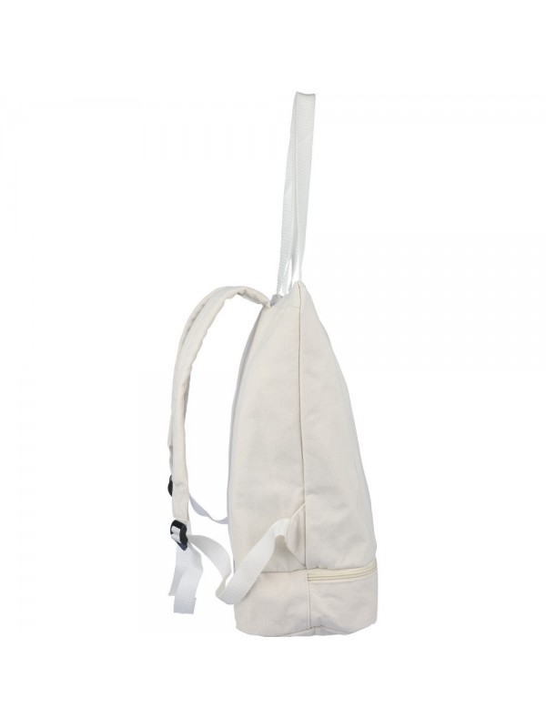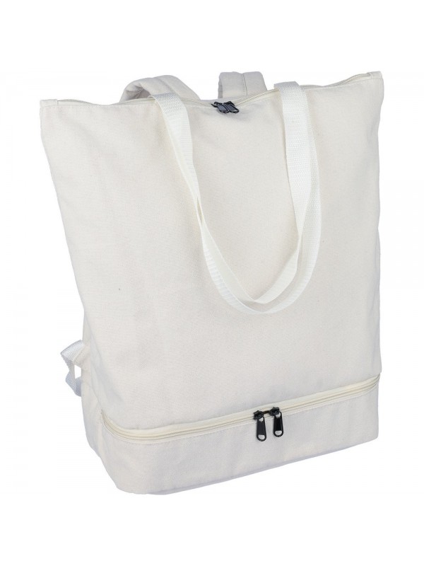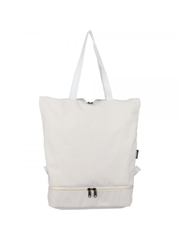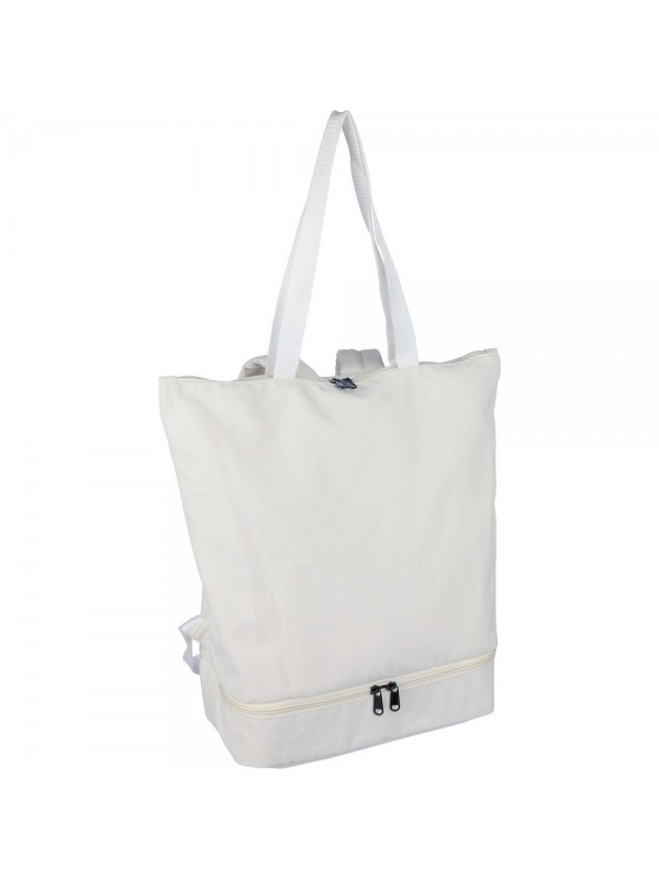 Plecak z funkcją torby na ramię, posiada dużą komorę zapinaną na zamek na górze, komorę zapinaną na zamek na dole, przegrodę na laptopa 15", dwie kieszenie wewnętrzne oraz jedną zewnętrzną kieszeń na zamek, konstrukcja obejmuje długie uchwyty do noszenia, wyściełane, regulowane szelki, pojemność: 30L, maksymalne obciążenie: 15 kg, produkt wykonany polibawełny z recyklingu (330 g/m²), podszewka z poliestru 210D