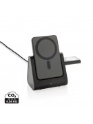 Ładowarka bezprzewodowa 3 w 1, bezprzewodowy, magnetyczny power bank 5000 mAh 5W, stacja dokująca do ładowania power banku, ładowarka bezprzewodowa 5W do słuchawek i drobnych akcesoriów, ładowarka bezprzewodowa 2,5W do smartwatchy (tylko iOS), wykonana z ABS z recyklingu z certyfikatem RCS, działa z telefonami posiadającymi możliwość ładowania indukcyjnego, wejście 5V/2.4A, wyjścia: 5V/1A, 5V/1A, 5V/0.5A, kabel 120 cm z TPE z recyklingu w komplecie, całkowita zawartość materiałów z recyklingu obliczona w oparciu o wagę całkowitą przedmiotu: 59%, w pudełku z certyfikatem FSC® mix