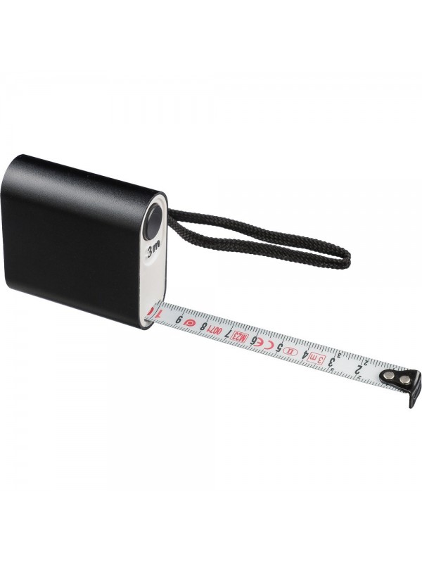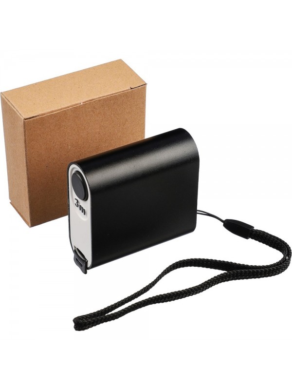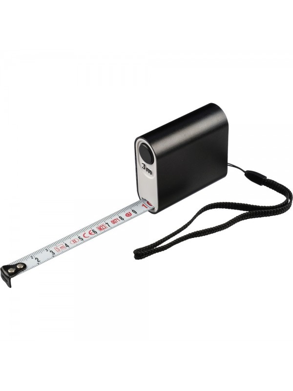 Miara 3m w centymetrach, opaska na nadgarstek ułatwiająca noszenie, zapakowana w brązowy kartonik, produkty wykonany z ABS i metalu