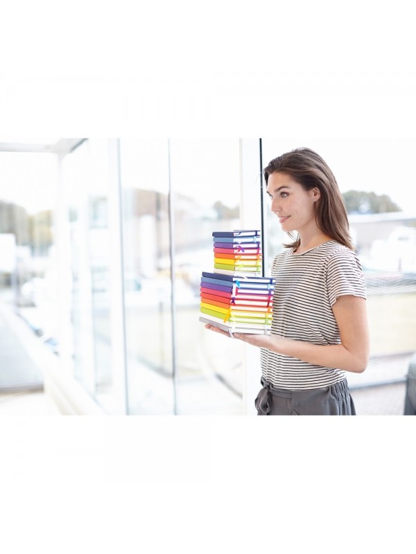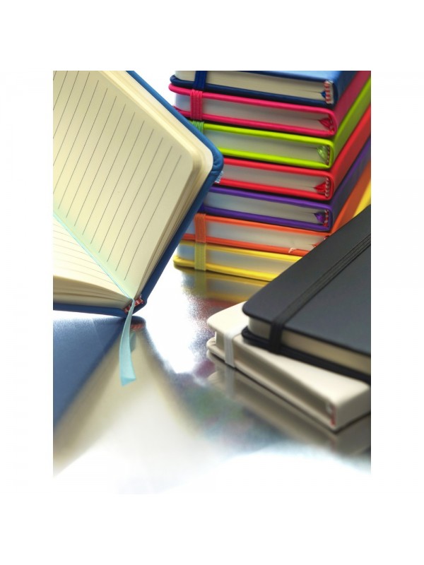 Notatnik w kieszonkowym formacie ok. A6, posiada 96 kartek w linie (192 strony), tasiemka zakładkowa umożliwia wygodne zaznaczanie ostatniej strony lub ważniejszych notatek, dodatkowe zamknięcie w postaci dopasowanej kolorystycznie elastycznej opaski, twarda okładka wykonana z PU