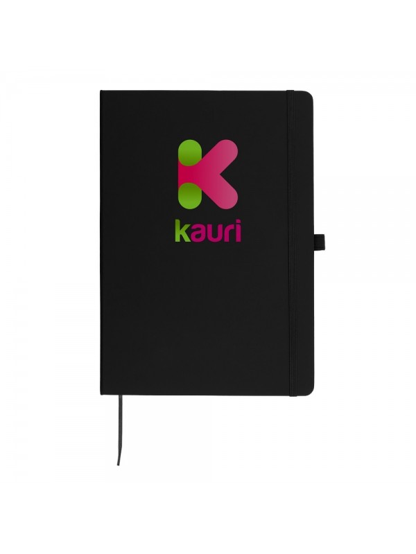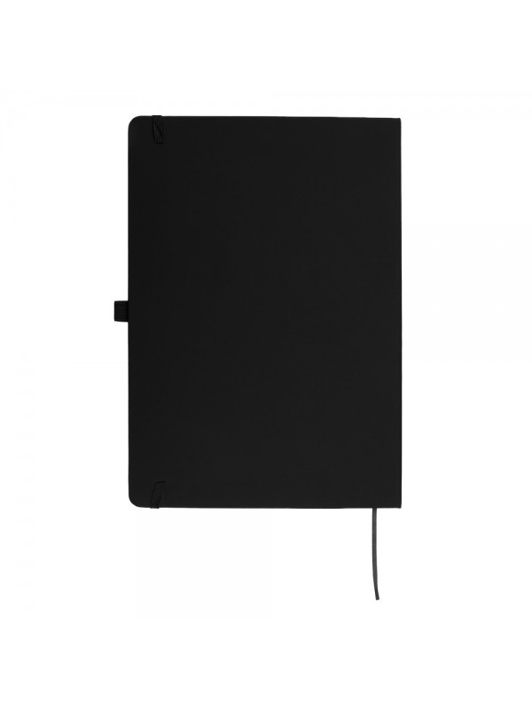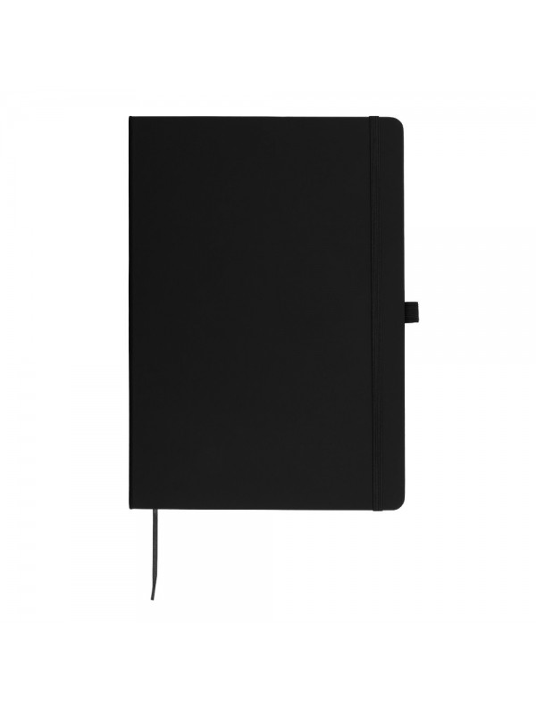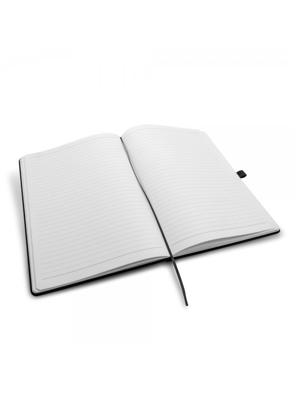Notatnik w formacie ok. A4, posiada 96 kartek w linie (70 gsm), tasiemka zakładkowa umożliwia wygodne zaznaczanie ostatniej strony lub ważniejszych notatek, dodatkowy gumowy uchwyt na długopis, twarda okładka wykonana z PU