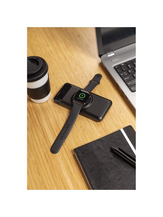 Power bank 10000 mAh, wbudowana ładowarka bezprzewodowa 3W może służyć do naładowania zarówno telefonu jak i smartwatcha, wskaźnik poziomu naładowania, 2 wyjścia USB do ładowania za pomocą kabla, wbudowany akumulator litowo-polimerowy klasy A o dużej gęstości i trwałości, w pełni naładowane urządzenie może naładować telefon do 5 razy, bezprzewodowe ładowanie jest kompatybilne ze wszystkimi urządzeniami posiadającymi możliwość ładowania indukcyjnego, wejście micro USB 5V/2A, wejście USB typu C 5V/2A, wyjście USB 5V/1A, wyjście bezprzewodowe do ładowania telefonu 5V/1A 5W, wyjście bezprzewodowe do ładowania smartwatcha 5V/0.6A 3W, kabel micro USB z TPE bez dodatku PVC w komplecie, ślad węglowy produktu: 4,44 kg CO2