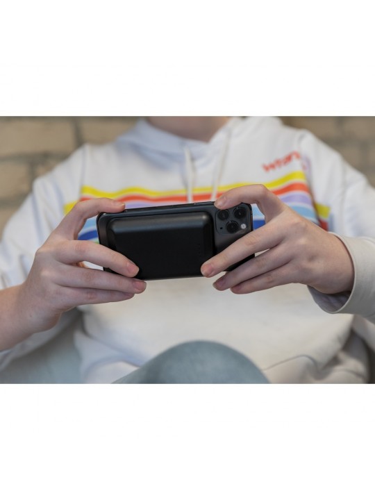 Magnetyczny, bezprzewodowy power bank 5000 mAh, ładowarka bezprzewodowa 5W, wyjście USB do ładowania za pomocą kabla, 11 wbudowanych magnesów N52H odpornych na ciepło, dzięki idealnemu rozłożeniu magnesów power bank jest kompatybilny z telefonem iPhone 12, w przypadku urządzeń Android działa jak standardowa ładowarka bezprzewodowa, działa z telefonami posiadającymi możliwość ładowania indukcyjnego, wejście 5V/1.5A, wyjście 5V/1A, 100 cm kabel micro USB z TPE w komplecie, nie zawiera PVC, ślad węglowy produktu: 3,19 kg CO2