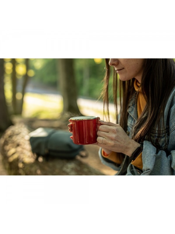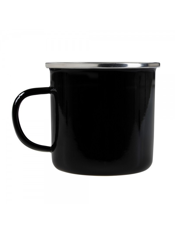 Emaliowany kubek 360 ml o błyszczącym wykończeniu, posiada białe wnętrze oraz krawędź w kolorze srebrnym, produkt wykonany z metalu