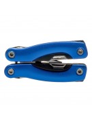 Narzędzie wielofunkcyjne w czarnym pokrowcu, posiada 12 funkcji oraz kolorowy uchwyt z czarnymi elementami, produkt wykonany z aluminium i stali nierdzewnej