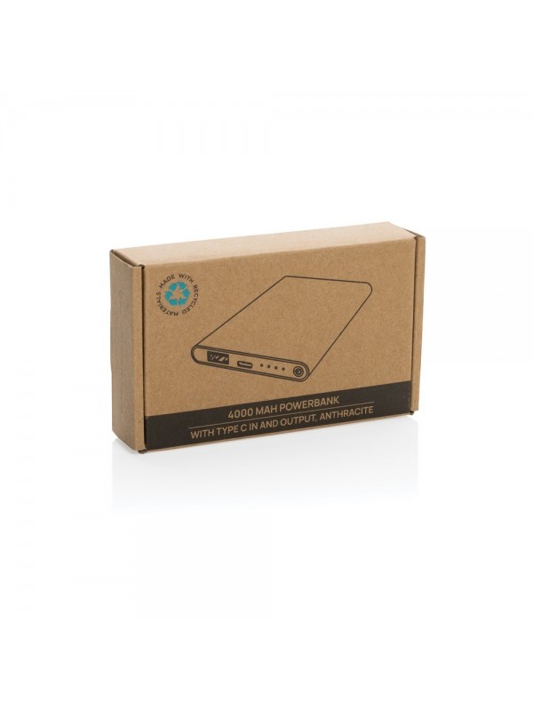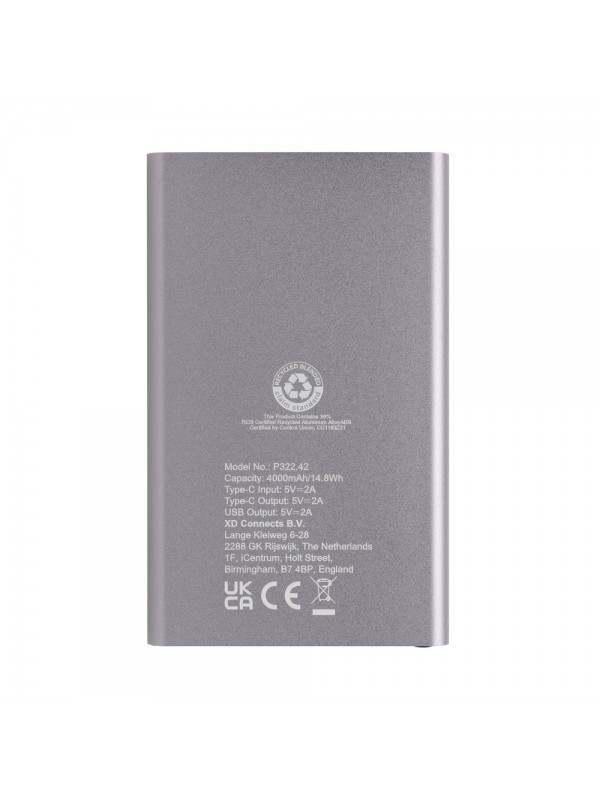 Power bank 4000 mAh, wskaźniki poziomu naładowania, wbudowany akumulator litowo-polimerowy klasy A, wykonany z aluminium i ABS z recyklingu, całkowita zawartość materiałów obliczona na podstawie wagi całkowitej przedmiotu: 66%, wejście USB typu C 5V/2A, wyjście USB typu C 5V/2A, wyjście USB 5V/2A, kabel z TPE z recyklingu z certyfikatem RCS w komplecie, w pudełku z papieru z certyfikatem FSC® mix, ślad węglowy produktu: 1,83 kg CO2