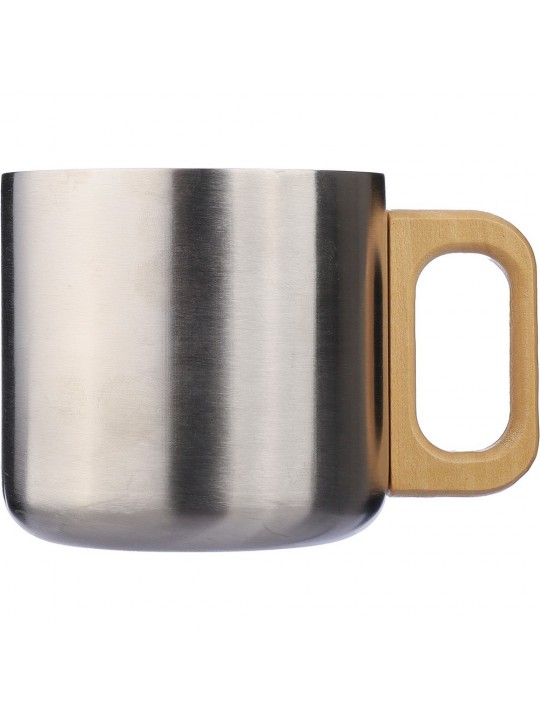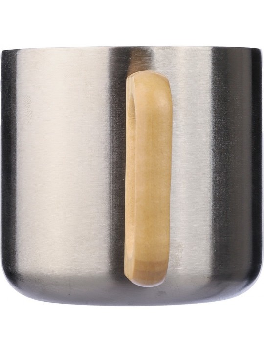 Kubek 400 ml posiada podwójne ścianki ze stali nierdzewnej z recyklingu, które chronią przed poparzeniem, solidny uchwyt z drewna, ikona stali nierdzewnej z recyklingu na produkcie, zapakowany w brązowy kartonik, produkt wykonany ze stali nierdzewnej