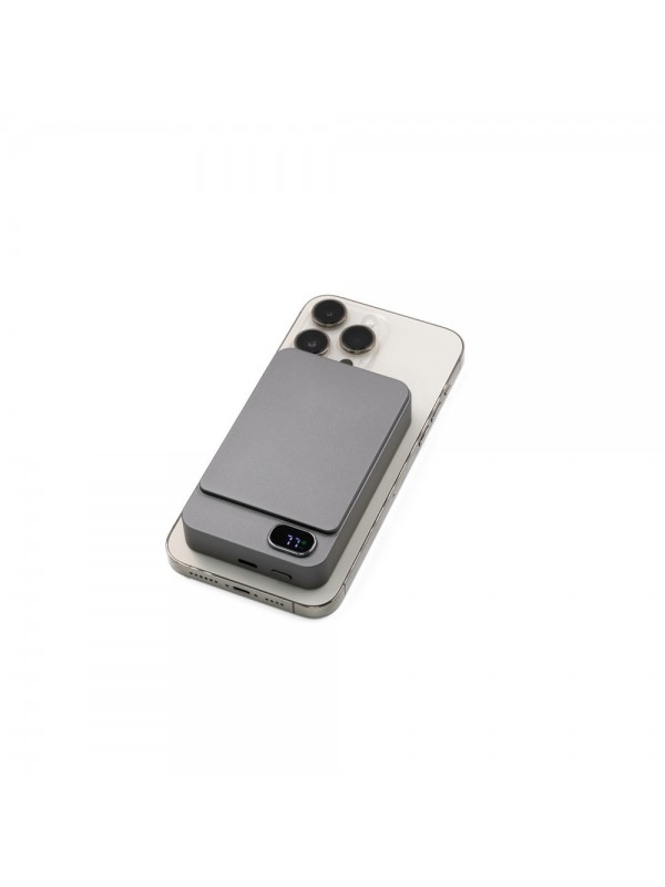 Powerbank BrandCharger Powerwave 10000, elegancka aluminiowa obudowa, pojemność 10 000 mAh, obsługuje szybkie bezprzewodowe ładowanie o mocy 15 W (kompatybilne z MagSafe, Qi1 i Qi2), port USB-C o mocy 20 W z PD 3.0 umożliwia zasilanie laptopów i innych urządzeń, wyświetlacz LCD pokazuje stan baterii, wyposażony w inteligentny chip, chroni urządzenia przed przetężeniem, przeładowaniem, przegrzaniem i zwarciem, zapewniając niezawodne i bezpieczne ładowanie, produkt wykonany z ABS i aluminium z recyklingu