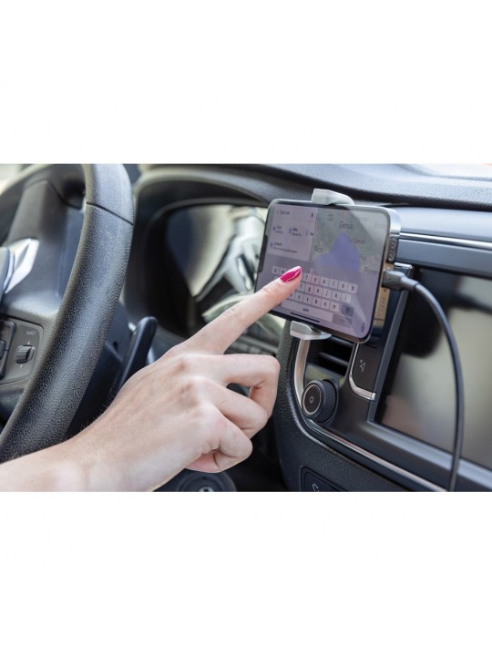 Regulowany samochodowy uchwyt do telefonu, mocowanie do wentylacji, obrotowy (360 stopni), wykonany w 37% z materiałów z recyklingu, mechanizm ze stali nierdzewnej wewnątrz, ślad węglowy produktu: 0,13 kg CO2