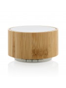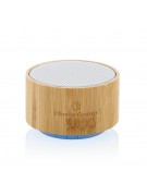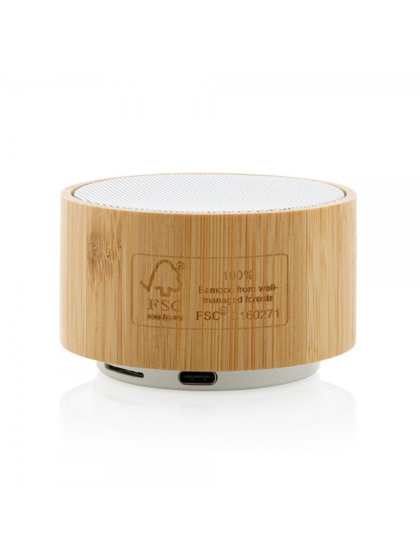 Głośnik bezprzewodowy 3W, BT 4.1 wykonany z bambusa i ABS z recyklingu, zawartość materiałów z recyklingu obliczona na podstawie wagi całkowitej przedmiotu: 16%, litowy akumulator o pojemności 300 mAh umożliwia odtwarzanie muzyki do 3 godzin, zasięg do 10m, z funkcją odbioru i mikrofonem do odbierania połączeń, w pudełku kraftowym z certyfikatem FSC® mix, kabel wykonany z TPE bez dodatku PVC w komplecie, ślad węglowy produktu: 2,39 kg CO2