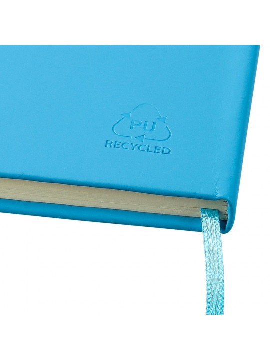 Notatnik ok. A5 RPET, z twardą okładką wykonaną z RPET PU, zawierający 80 stron w linie (70 g/m²), tasiemka zakładkowa umożliwia wygodne zaznaczanie ostatniej strony lub ważniejszych notatek, dodatkowe zamknięcie w postaci kolorowej elastycznej opaski, ikona recyklingu na tylnej stronie