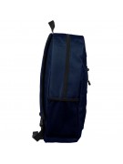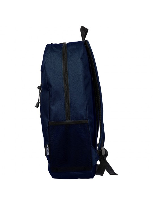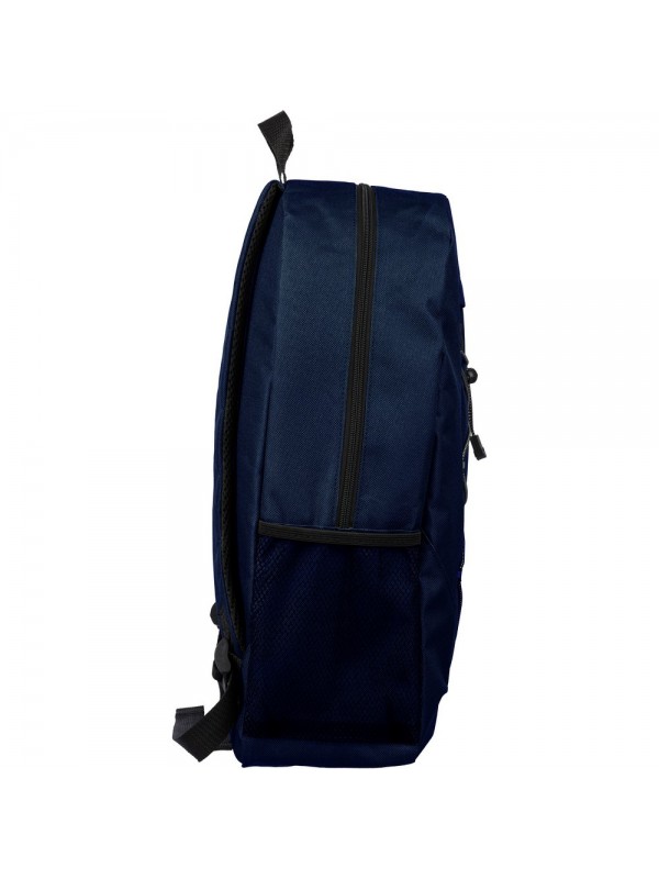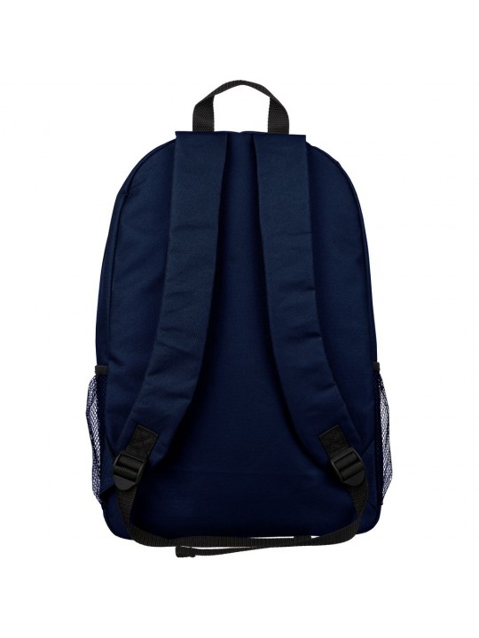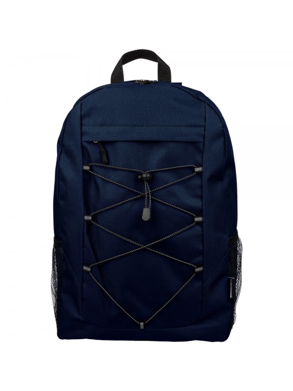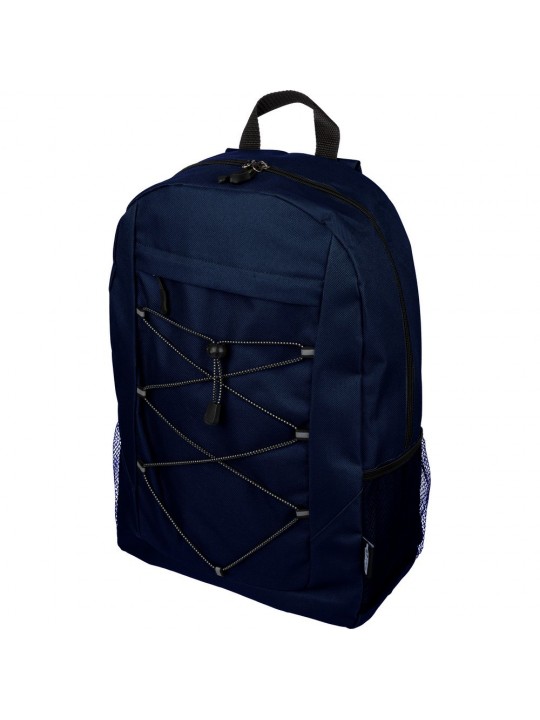 Plecak podróżny, siatkowate kieszenie po obu stronach, elastyczne sznurki z przodu do przymocowania butelki albo koca, zaciskane zamknięcie, mała kieszeń zapinana na zamek z przodu, kieszeń główna zapinana na zamek, ikona RPET na metce, produkt wykonany z RPET, poliestru i elastanu