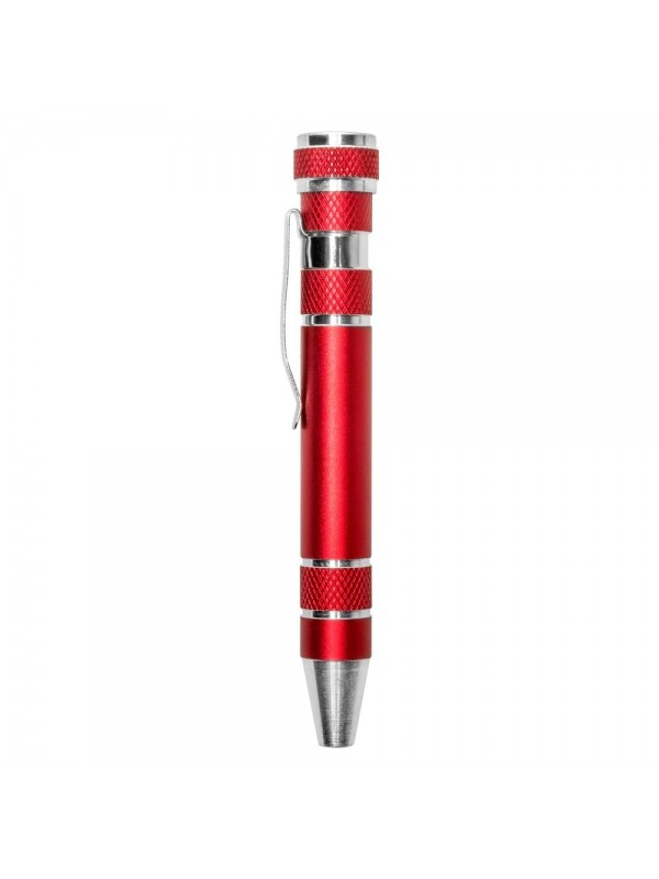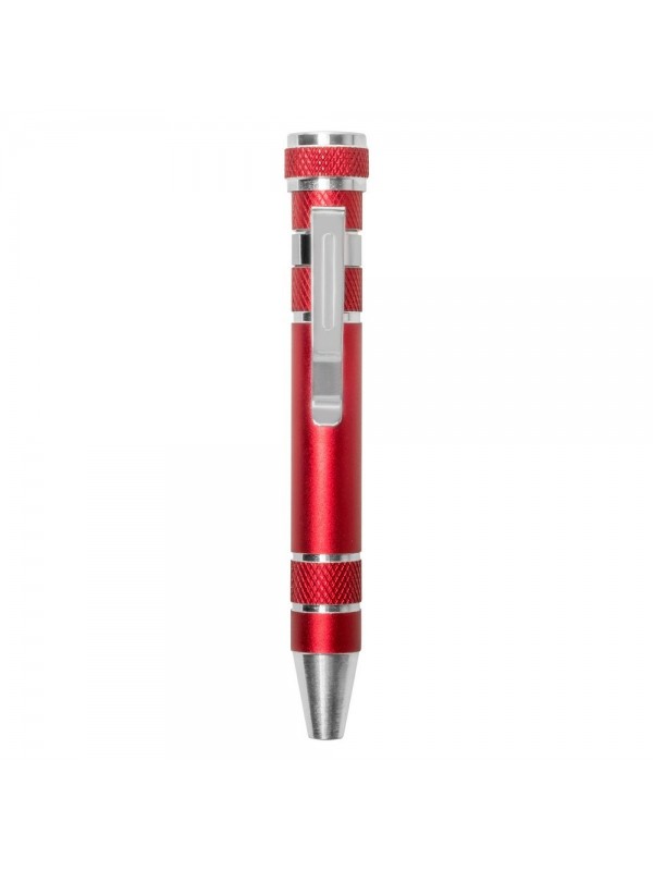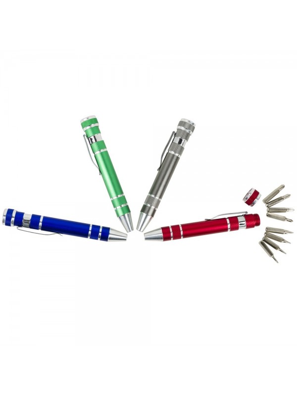 Śrubokręt w kształcie długopisu z 4 płaskimi i 4 krzyżakowymi końcówkami, posiada klip umożliwiający przypinanie, produkt wykonany z aluminium i stali